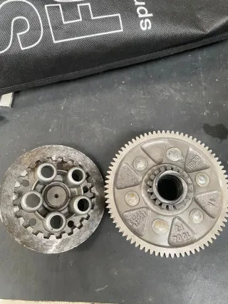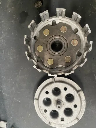 Conjunto de maza y prensa de embrague para Derbi Euro 3. - Maza de embrague con rodamiento central. - Prensa de embrague con orificios de ventilación.