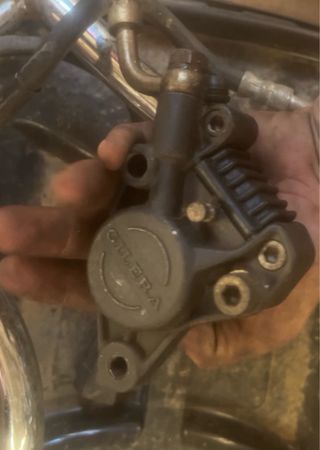 Conjunto de freno delantero para Aprilia RS 50 modelo Chesterfield. - Pinza de freno dorada. - Maneta de freno plateada. - Latiguillo de freno negro.