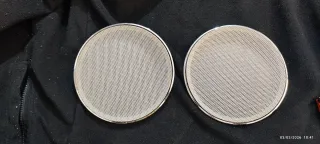 Juego de dos rejillas protectoras para altavoces de Mercedes Clase B, modelo 245W. Originales - Solo delanteras - Diseño circular con acabado plateado. - Rejilla plástica con patrón de pequeños orificios. - Borde exterior cromado. - En buen estado sin partidos