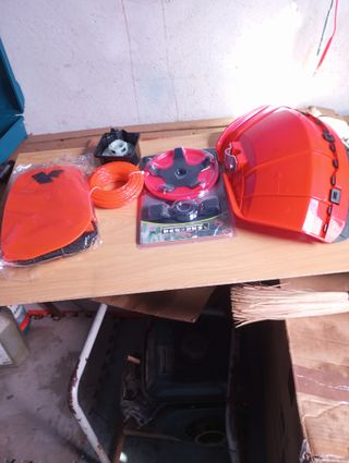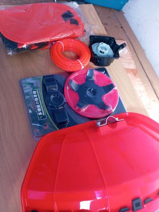 Se venden recambios para desbrozadora. Incluye un cabezal y una bobina de hilo de nylon de color rojo. El cabezal y el arnés parecen nuevos, sin señales de uso. - Cabezal de recambio para desbrozadora. - Bobina de hilo de nylon rojo. - Arnés para desbrozadora, color naranja y negro.