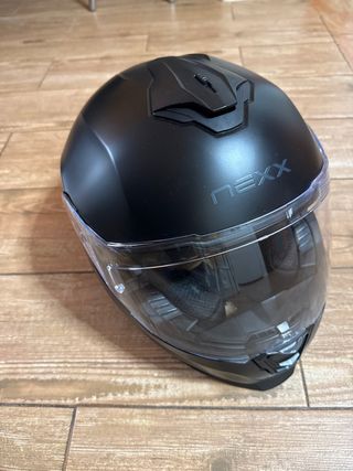Casco integral Nexx en color negro. - Diseño moderno y aerodinámico. - Visera transparente y negra extra - Marca Nexx grabada en el lateral. - compatible para poner intercomunicador. - visera integrada para sol. - talla L 59-60 cm -nuevo