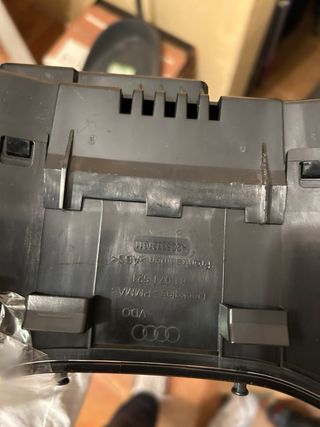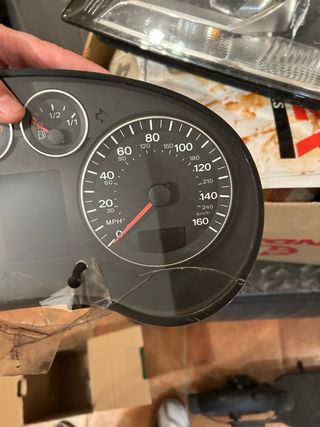 Cuadro de instrumentos para Audi A3 8P. Se aprecia una grieta en la parte inferior derecha de la cubierta. - Indicador de combustible. - Velocímetro hasta 240 km/h y 160 MPH. - Tacómetro hasta 8000 RPM.