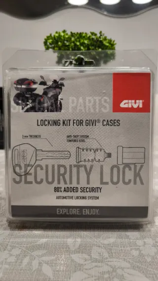 Kit de cerradura de seguridad Givi SL101 para maletas. - Incluye bombín y dos llaves. - Sistema anti-robo. - Fabricado en acero templado.