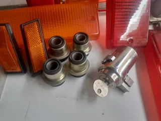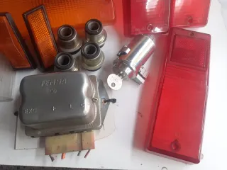 Lote de recambios varios para Seat 124 D. - Intermitentes naranjas. - Pilotos traseros rojos. - Regulador FERMASA BXC. - Bombines con llave. - Varios soportes.