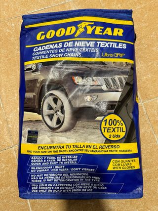 Cadenas de nieve textiles Goodyear, modelo Ultra GRIP. Incluye 2 unidades. Nuevos a estrenar. - Producto patentado. - Rápido y fácil de instalar. - Silenciosas, no vibran. - No deterioran el neumático. - Uso solo en carretera con nieve o hielo. - Incluye guantes.