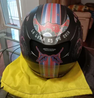 Casco de moto integral con un diseño moderno y llamativo. Perfecto para protegerte en tus trayectos. - Diseño con líneas verticales y rombos en tonos grises, rosas rojizos y morados. - Interior acolchado para mayor comodidad. - Visera transparente.