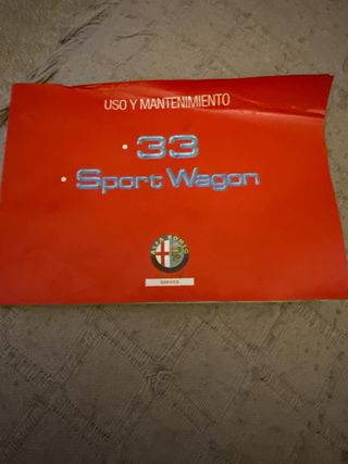 Manual de uso y mantenimiento para el Alfa Romeo 33 Sport Wagon. - Cubierta roja con detalles plateados. - Incluye el logo de Alfa Romeo. - Etiqueta de 'Service' en la parte inferior.