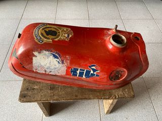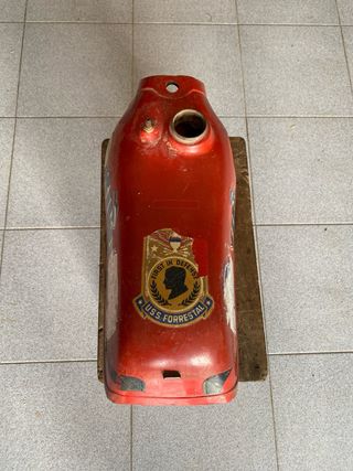 Depósito de combustible para moto Montesa, de color rojo. Con grifo de gasolina. Presenta algunas marcas de uso y óxido solamente en la boca del tapón, como se aprecia en las imágenes.