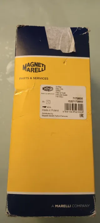 Filtro de aceite de la marca Magneti Marelli. - Referencia: 71758600 - Código EAN: 8001063523002 - Fabricado en Polonia. - Distribuido por Magneti Marelli Parts & Services.