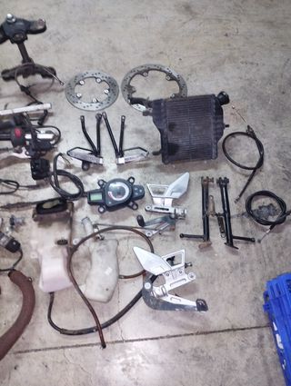 Se venden recambios de Yamaha TZR usados. Están en buen estado general, aunque con señales de uso. - Incluye varias piezas, como el escape, radiador, instrumentación, manillar, discos de freno instalación eléctrica marcador piñas luces arranque estárter vaso expansión botella aceite pata de cabra caballete tijas horquillas espejos retrovisores juego de bombines maletero depósito y contacto depósito gasolina pinza de freno tapa piñón cadena bomba de freno delantera y trasera cdi soportes estriberas delanteros y traseros contrapesos manillar semi manillar izquierdo y derecho cables embrague y acelerador - Ideal para reparar o r