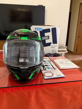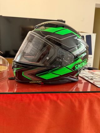Casco Shoei NXR2 Prologue TC4 con un diseño llamativo en verde, negro y plata. - Diseño aerodinámico. - Visera clara. - Cierre de seguridad. - Se incluye visera fotocromatica de regalo. - Modelo nuevo a estrenar proveniente de Stock en tienda. -Somos tienda. - Talla Xs. - Se incluyen todos los accesorios. Caja, Pinklook, funda..... -Puede contener alguna marca de prueba en tienda. #Kawasaki, #moto.