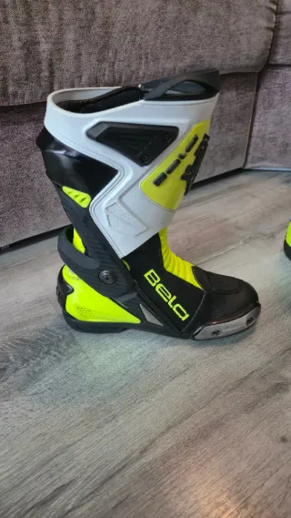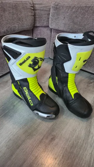 Botas de moto Bela en color negro y amarillo neón, diseñadas para competición. En las fotos se ve mal no se porque pero la piel esta perfecta. - Diseño deportivo y protector. - Cierre con cremallera y velcro. - Suela antideslizante. - Talla 41 Entrega en mano.