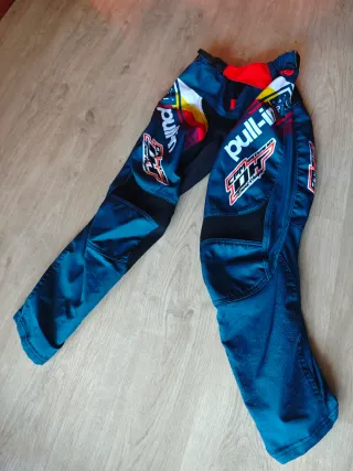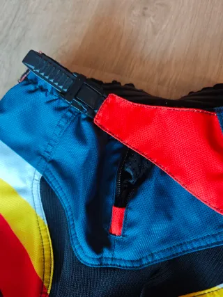 Pantalónjunior de enduro y motocross talla US 26. - Color azul marino con detalles en rojo, blanco y amarillo. - Tejido resistente y flexible. - Paneles de ventilación. - Refuerzos en rodillas.