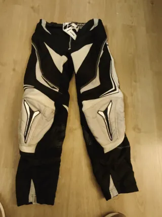 Pantalón de enduro y motocross en talla 32. Un pequeño roce en un rodillera como se aprecia en la foto y nada más. Muy buen estado. - Diseño en negro y blanco. - Acolchado en rodillas. - Cierre de cremallera y botón.