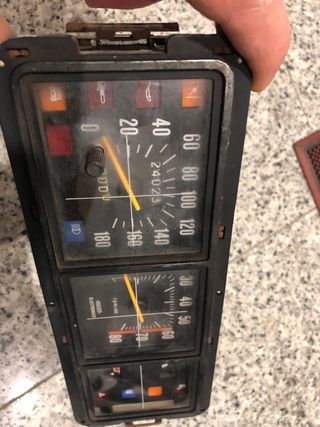 Cuadro de instrumentos para Renault clásico. Incluye velocímetro, tacómetro y testigos luminosos. - Velocímetro hasta 180 km/h. - Tacómetro hasta 8000 rpm. - Indicador de combustible. - Testigos de luces, freno de mano, etc.