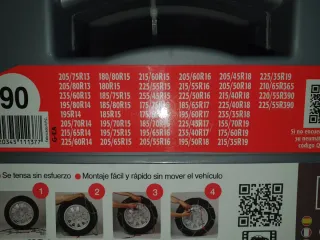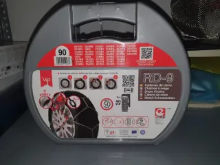 Cadenas para nieve modelo RD-9, aptas para diversas medidas de neumático. - Incluye instrucciones de montaje. - Indicación de velocidad máxima de 50 km/h. - Compatibles con ABS y ESP. - Grosor de la cadena de 9mm. Vendo por error de medida.
