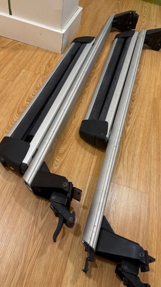 Portaesquís de aluminio con soportes de sujeción. - Material: Aluminio y plástico negro. - Diseño aerodinámico.