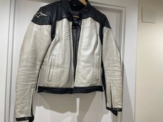 Chaqueta de cuero para moto Alpinestars Stella, para mujer, Talla M, con un diseño bicolor en blanco y negro. - Material: Cuero. - Color: Blanco y negro. - Diseño con perforaciones en las mangas. - Cremallera frontal. - Cuello alto con cierre de botón a presión. - Incluye protecciones en los hombros y codos - Incluye chaleco interior para los dias de frio que se ata con cremallera