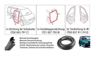 kit completo de juntas de goma de alta calidad para Volkswagen Transporter T4 (Multivan, Caravelle, California, Eurovan). Este set está diseñado para ofrecer el máximo aislamiento térmico y acústico. ¿Qué incluye el kit? • 1x Junta para Puerta Corredera (Ref: 7D0 843 791 C). • 1x Junta para Portón Trasero (Ref: 721 827 705 B). • 2x Juntas para Puertas Delanteras (Izquierda + Derecha) (Ref: 7D0 837 911/912). Totalmente nuevas a estrenar