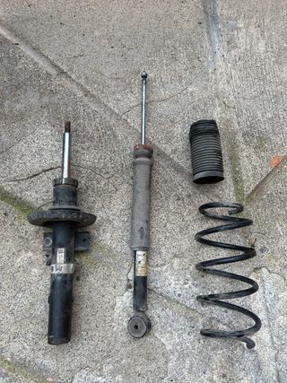 Conjunto de muelles y amortiguadores originales para Seat Ibiza 6L. Incluye un amortiguador delantero y un amortiguador trasero. HE PUESTO FOTOS DE UNA DE CADA COSA PERO TODO ESTA GENIAL Y EN EL MISMO ESTADO QUE ESOS - Amortiguador delantero con muelle y copela. - Amortiguador trasero. - Guardapolvos de goma. los amorriguadores estan COMO NUEVOS, yo los cambie por que puse suspension roscada. -ni tiran aceite mi se quedan hundidos ni nada vendo todo el conjunto de suspension y regalo las bieletas originales tambien en muy muy buen estado