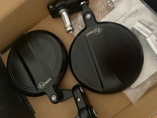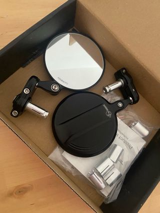 Set de espejos retrovisores para moto estilo café racer. - Marca KEMIMOTO. - Diseño redondo. - Acabado en negro. - Incluye accesorios de montaje con diferentes anchos para todo tipo de manillares. Estan nuevos sin usar. IMPORTANTE están homologados, es legal llevarlos.