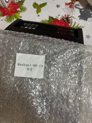 Marco embellecedor para la radio de un Nissan Qashqai. Pieza de plástico negro mate. - Diseñado para doble DIN. - Incluye marco y soporte.