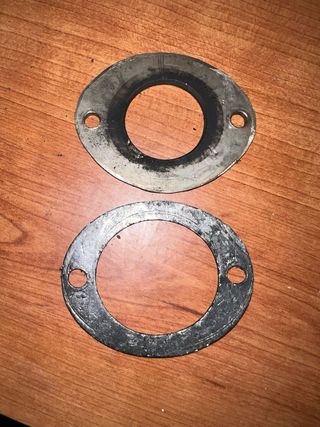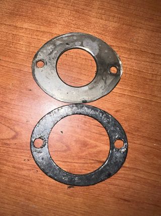 Se venden dos juntas de escape metálicas. Son piezas circulares con dos orificios para su fijación. - Material metálico. - Forma circular. - Dos orificios de montaje.