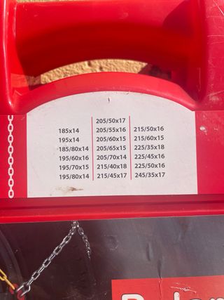 Cadenas para nieve sin estrenar, modelo Rombo. - Tamaño 80. - Incluye lista de medidas compatibles. - Peso neto: 2.95 KGS. - Peso bruto: 3.45 KGS. - Homologación TUV GS.