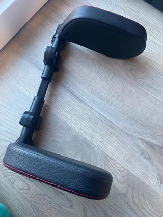 Reposacabezas para coche con diseño ajustable. Ver fotos donde se indican medidas de posibles ajustes. En perfecto estado. - Material: Piel sintética negra con costuras rojas. - Estructura: Plástico negro. - Ajustable en altura y ángulo.