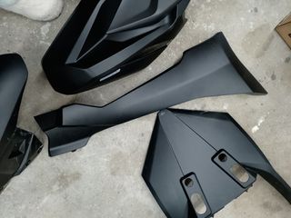 Conjunto de varias piezas de plástico negro para moto. Varias piezas carenado negro SYM JET X, carenado delantero izquierdo, guardabarros, quilla izq, y bajo cupula - Piezas de carenado. - Acabado mate.