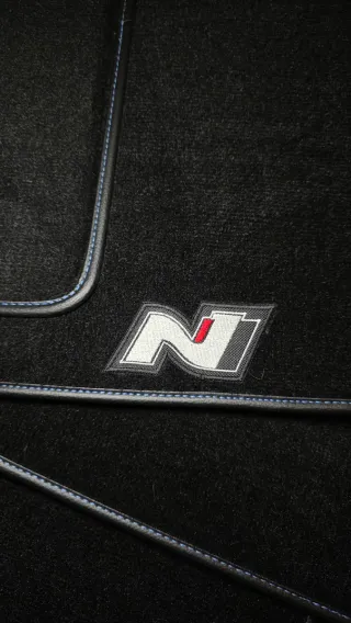 Alfombrillas delanteras para Hyundai i30N. - Logo N bordado en blanco y rojo. - Ribete y costuras en contraste azul.