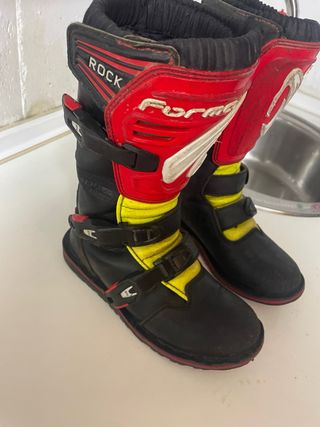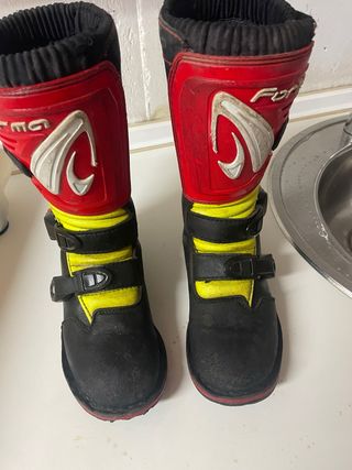 Botas de trial para niño de la marca FORMA, modelo ROCK. Diseñadas para ofrecer protección y comodidad en la práctica del trial, estan muy nuevas como se aprecia en la foto, muy poco usadas por un niño de 7 años - Color negro y amarillo con detalles en rojo. - Cierre con hebillas. - Caña alta para mayor sujeción.