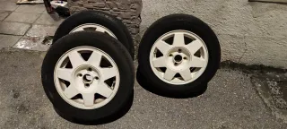 Juego de cuatro llantas de aleación en color blanco. 4x100 et38 6jx14 Original de Volkswagen Valido para Opel Renault Seat Audi Con gomas a medio uso y una pinchada