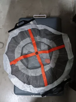 Cadenas textiles para nieve, diseñadas para mejorar la tracción en superficies resbaladizas. - Material textil resistente. - Diseño circular con cintas naranjas. - Incluye bolsa de almacenamiento.