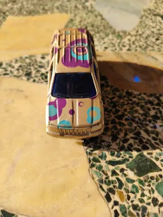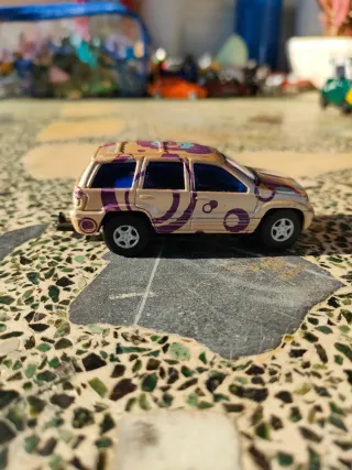 Miniatura de Jeep Maisto del año 1999. Un modelo con un diseño llamativo. - Color dorado con estampado floral en morado y azul. - Ventanas tintadas.