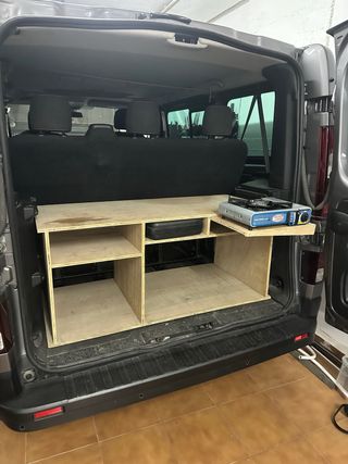 Mueble de madera hecho a medida para Fiat Talento. - Diseño funcional con compartimentos. - Material de madera - Térmicos para todas las ventanas - colchón seminuevo con viscolastica. - Avancé hinchable 2,5 x 2,5 mts.