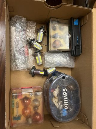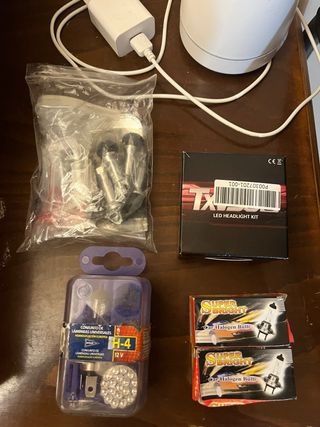 Se venden piezas de repuesto para Seat Leon, incluyendo un kit de faros LED y bombillas H4. - Kit de faros LED. - Bombillas H4 (12V) Super Bright para coche. - Conjunto de lámparas universales H-4 Algunas bombillas pueden no funcionar ya que tienen años en la caja paradas y no tengo manera de comprobar su funcionamiento. Tengo una caja de fusibles nueva sin usar 15€