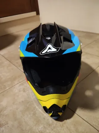 Casco Acerbis para moto de enduro o motocross. TALLA M, un solo uso. Está como nuevo. - Exterior en negro, azul y amarillo. - Visera aerodinámica. - Interior cómodo y seguro.