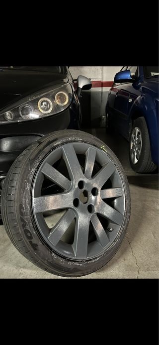 Juego de llantas de aleación para Peugeot 207. - Diseño de 5 radios. - Acabado en color gris oscuro. - Tienen algún signo del uso. - Precio negociable. - Dos neumáticos sin vida y otros dos a mitad de vida.
