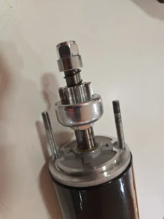 Motor de arranque para embarcaciones fueraborda. Pieza metálica con acabado negro y detalles plateados. Compatible con motores Chrysler - Engranaje visible en la parte superior. - Dos varillas roscadas a los lados.