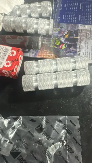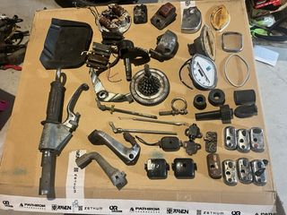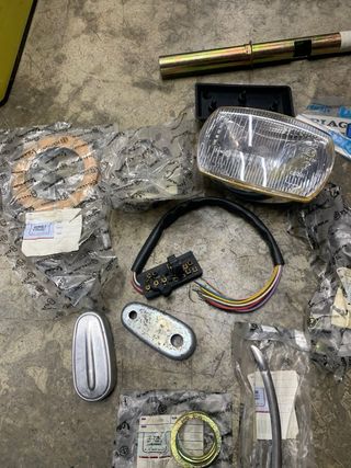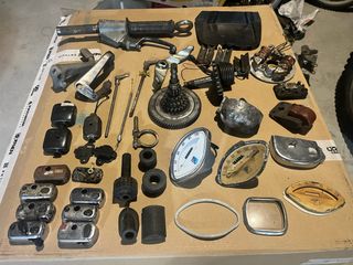 Lote de recambios para Vespa clásica. Incluye varias piezas nuevas, otras en buen estado, y otras aprovechables aun. - Variedad de componentes para restauración. - Piezas de diferentes tamaños y formas.