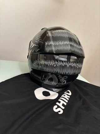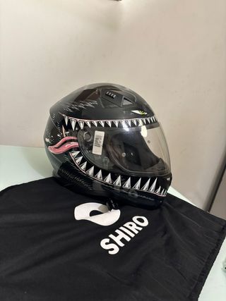 Casco de moto SHIRO con un llamativo diseño de tiburón. - Color negro con detalles gráficos. - Visera transparente. - Incluye bolsa de tela SHIRO. - Talla XL
