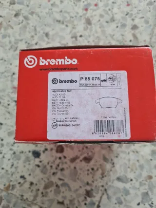Pastillas de freno delanteras Brembo P 85 075. - Aplicables para Audi A3, TT; Seat Altea, Ibiza V; Skoda Octavia; VW Golf V, Passat, Touran. - Incluye 1 juego / 4 piezas. - Homologación E20 90R-02A0124/037.