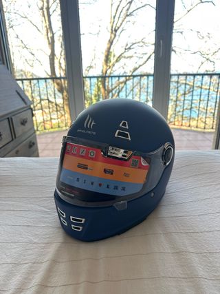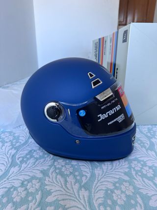Casco de moto MT Jarama en color azul mate y talla L. Diseñado para ofrecer seguridad y comodidad. - Calota externa de policarbonato. - Cierre de doble anilla. - Interior extraíble y lavable. - Visera preparada para Pinlock. -Casco completamente nuevo, con etiquetas y sin usar. Lo vendo porque compré dos iguales y no me caben ambos en el maletero de la moto