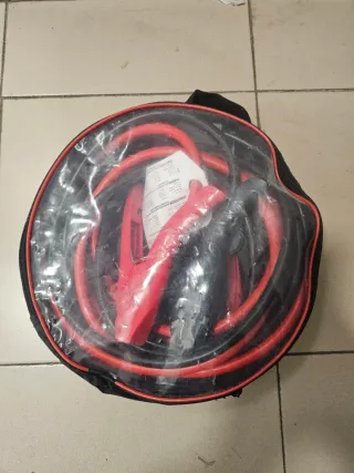 Pinzas de arranque para coche guardadas en su bolsa. - Pinzas de color rojo y negro. - Bolsa de transporte negra con ribete rojo.