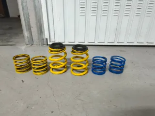Conjunto de muelles de la marca FK Automotive. Se incluyen muelles de color amarillo y azul. - Muelles amarillos - Muelles azules - Muelles procedentes de una suspensión roscada de un vw golf v. - Pueden valer como sustitución, o como para proyecto de kart, kart cross o similar.