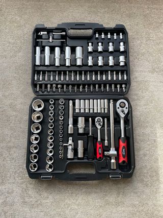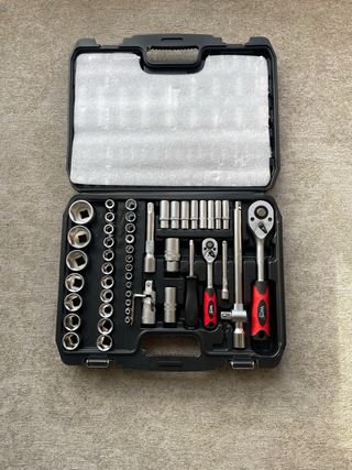 Completo maletín de herramientas con 108 piezas. - Incluye llaves de vaso, carraca y accesorios. - Diseño compacto y portátil.