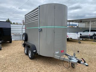 Tipo: Van. Modelo: Caballo y medio y 2 caballos. Medidas: Desde 2.90m x 1.55m x 2.10m de lateral. MMA: 750 kilos. Hasta 3500 kilos. Tara (aprox): 600 kilos. Ruedas: 155- 80 R13 Cabestrante: Opcional. Lanza: En V de 60 por 60 mm. Reforzada. Tipo de Cabezal: Semiautomático de 1600 kilos. Ejes: 2 unidades de 1000 kilos. Hasta 1800 kilos. Freno: Incluido. Puerta: Trasera y lateral en rampa y en apertura lateral. Inst. eléctrica: 7 pines. En caso de matriculación, instalación eléctrica de 13 pines con luz de marcha atrás. Luces: Freno, posición, intermitente, antiniebla trasero y gálibo. Luz interior. Material: Hierro soldado y pintado.