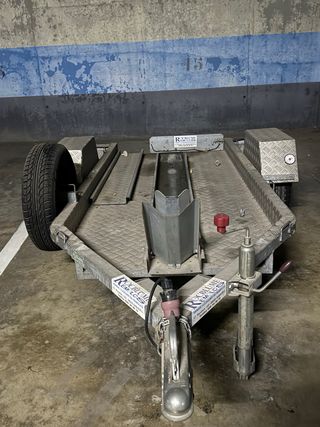 Remolque ligero para una moto, muy estable, con pocos km y en perfecto estado, muy cómodo en marcha, casi ni se nota que los llevas. Se entrega documentación del remolque. - Plataforma con guías para la rueda. - Rueda de repuesto incluida. - Rueda jockey - Cabezal de enganche. - Soporte basculante para rueda delantera ajustable a diferentes tamaños de llanta. - Suelo de chapa.