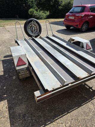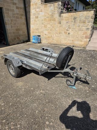 Remolque para transportar motocicletas, ideal para el traslado de motos. Es ligero y fácil de manejar. - Estructura de metal resistente con base de madera para darle mas rigidez. - Capacidad para tres motos de carretera o 5 de campo. - Rueda de recambio incluida. - Se encuentra en buen estado -Rueda grande de 13 pulgadas para mayor estabilidad en carretera Medidas ultima foto no dudeis en consultar precio negociable